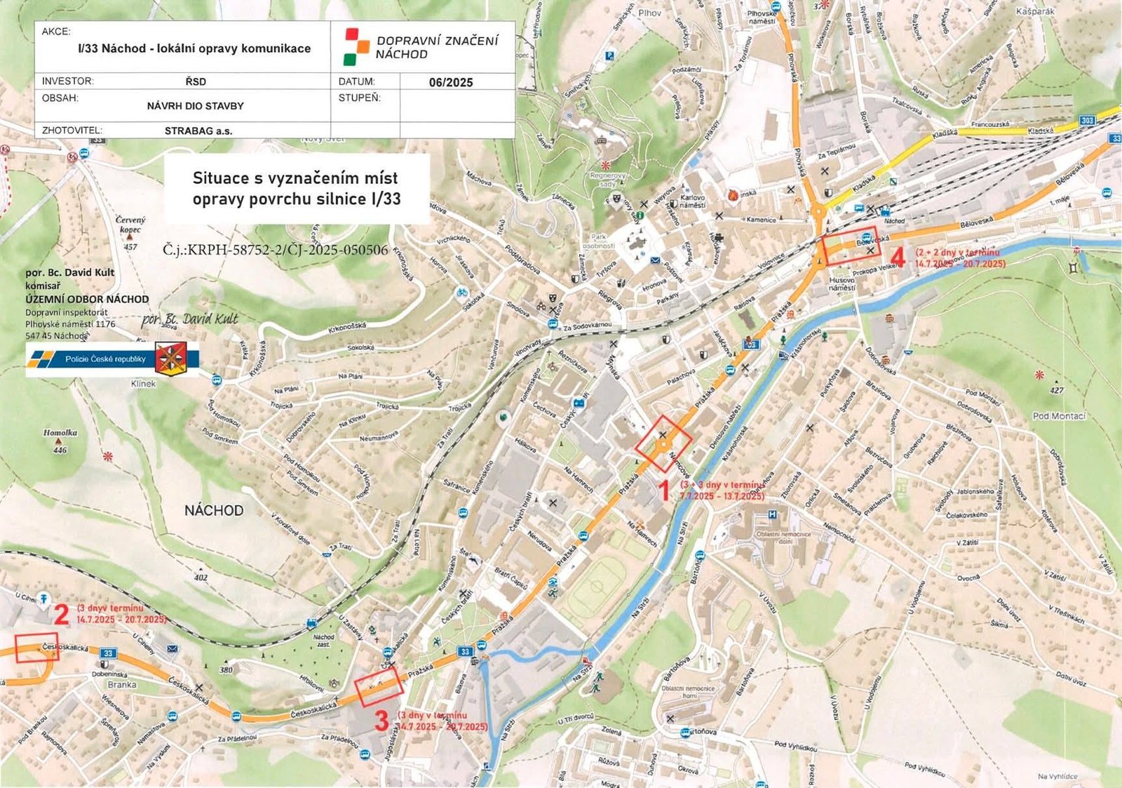Darbai vyks Nachodo centre ir keliose pagrindinėse sankryžose, įskaitant:
